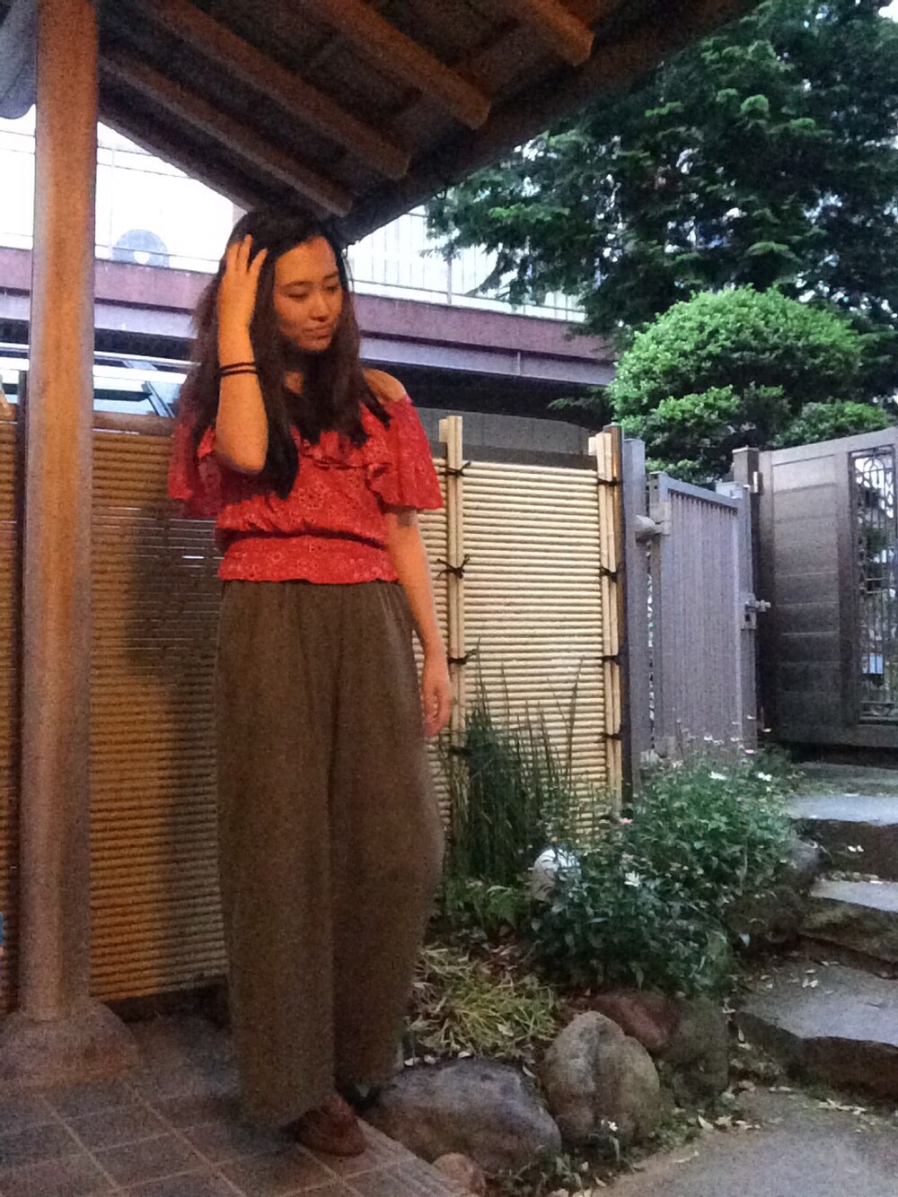 バンダナ柄のオフショルダーと履いてるといつも素材を褒められるワイドパンツ👍🏻💓
