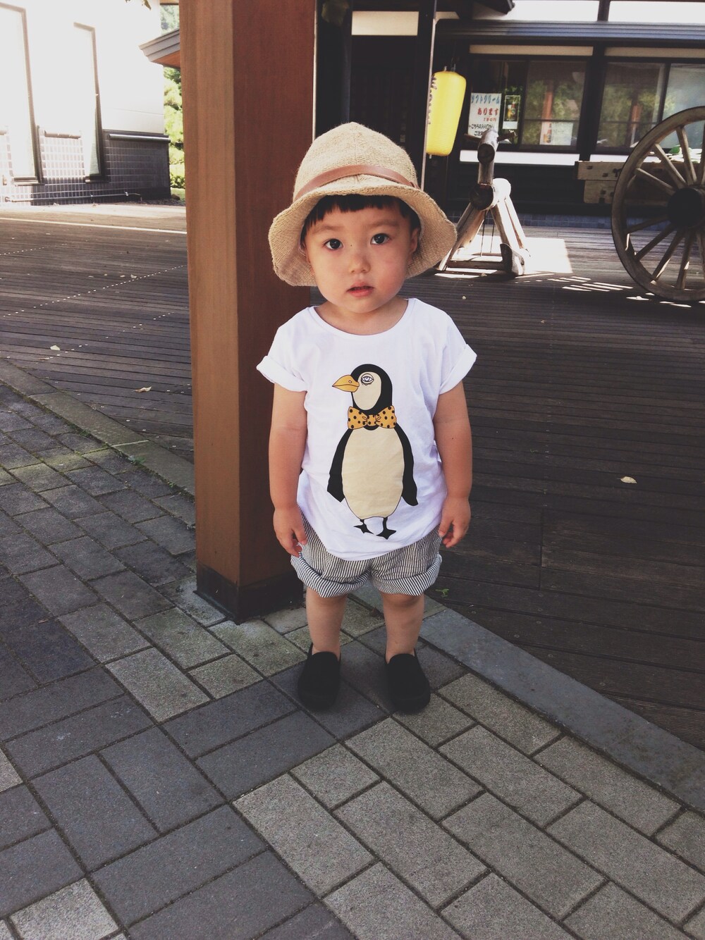 ホワイト系のTシャツ/カットソーを着用したキッズの秋コーディネートの1枚目の写真