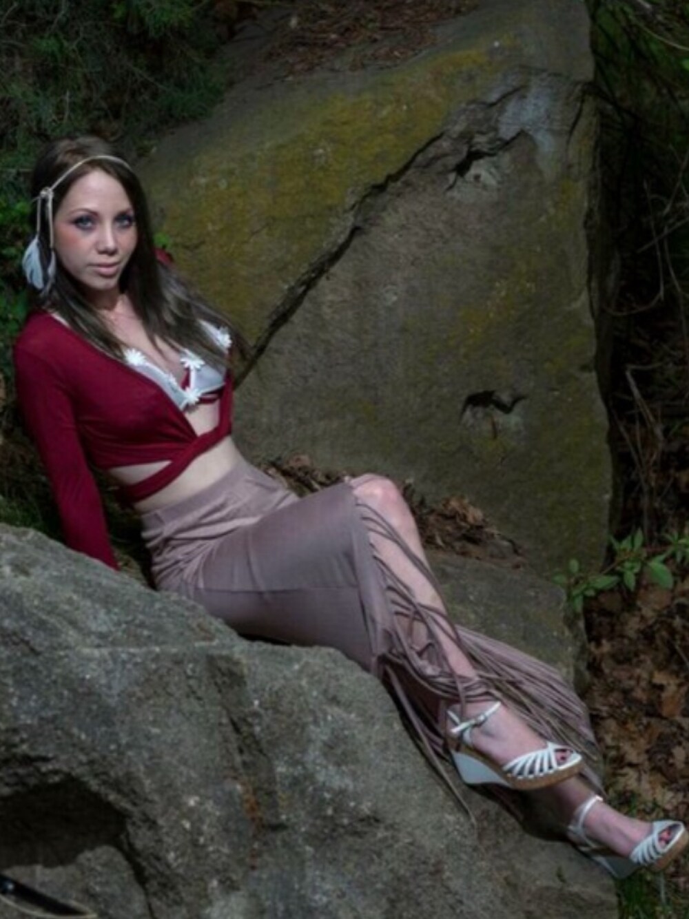 Wearing my white daisy bra with my red wrapped cardigan and my fringed flow skirt, my white pumps and my white feathered headband