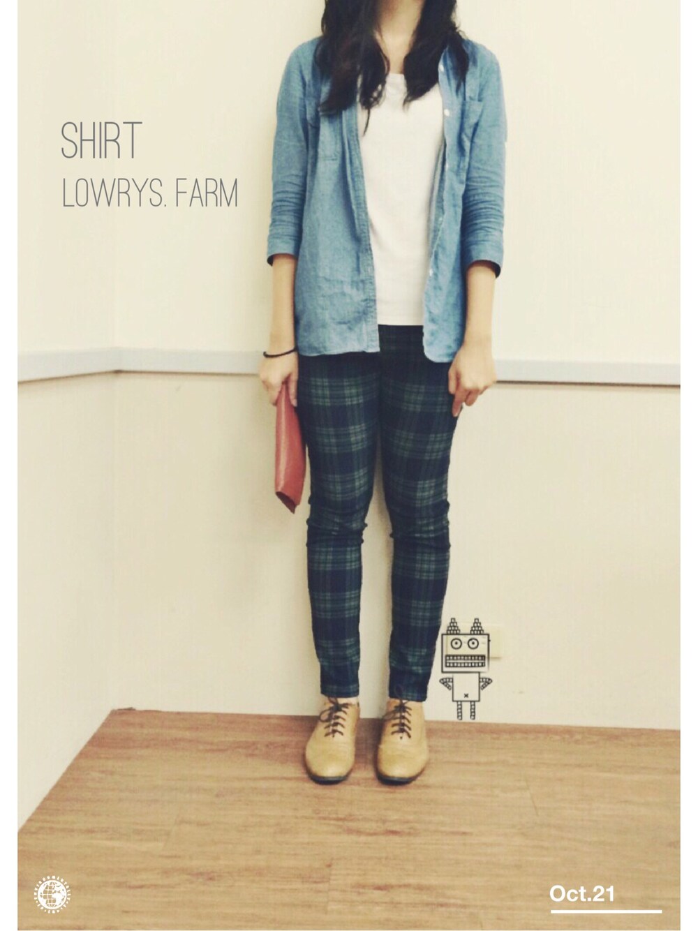 チェックパンツ デニムシャツ オックスフォード靴 ホワイトTシャツ アキ🍁