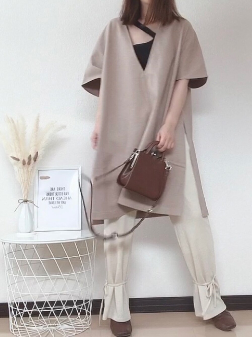 胸元の深めVネックから覗くZARAのアシメトップスが可愛い❤︎ 上下ベージュなので小物はブラウンで統一。 サイドスリットも深く入ってるのでカラーパンツや柄物も合わせたいな🙆♀️ シアートップスやハイネックと合わせて初秋まで全然使えそう! ボトムスは楽チンすぎる一癖パンツ!