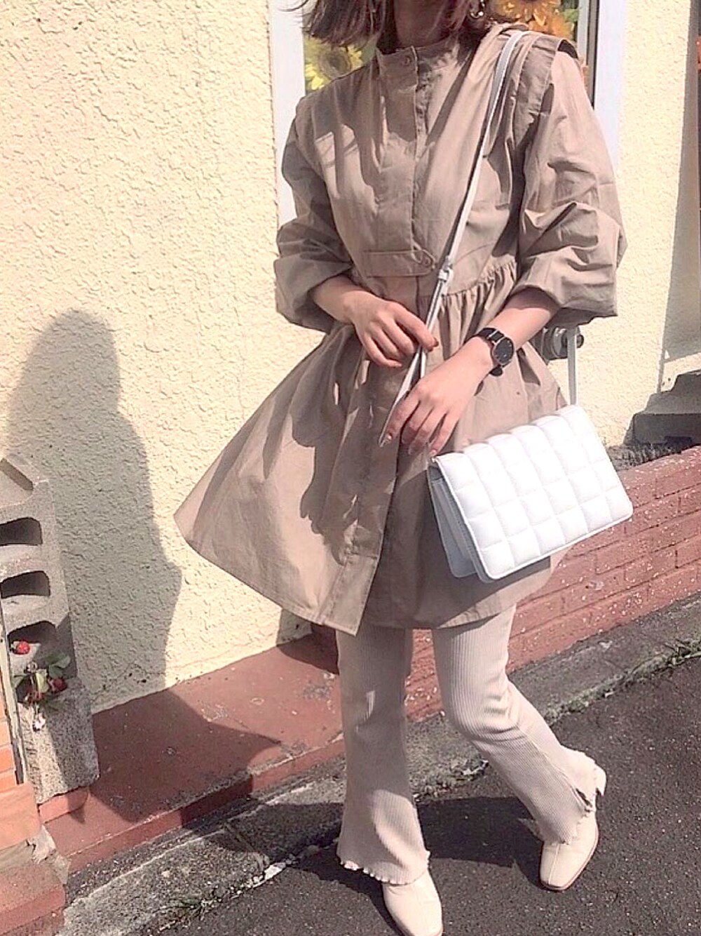 お気に入りのチュニックシャツ🤍 袖を捲ればパフスリっぽくなって今時期ぴったり! ベージュワントーンコーデ大好き🥰