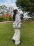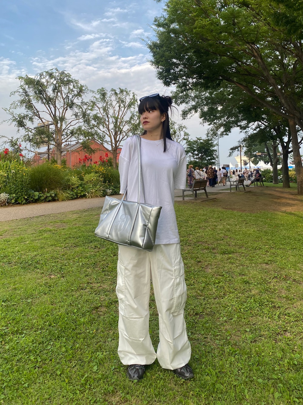 IG @ayanoiam オールホワイトにシルバーバック🩶髪の毛は無造作にまとめてハーフアップ🫶🏻オールホワイトでシンプルだからこそメイクはしっかりめにダサくならないように🥣 クッションファンデはromand アイメイクはclioのモーブ系ピンク リップはプラム系のperiperaとMerzyのグラデ コーディネートだけでなく、メイクもしっかりメリハリを🩶