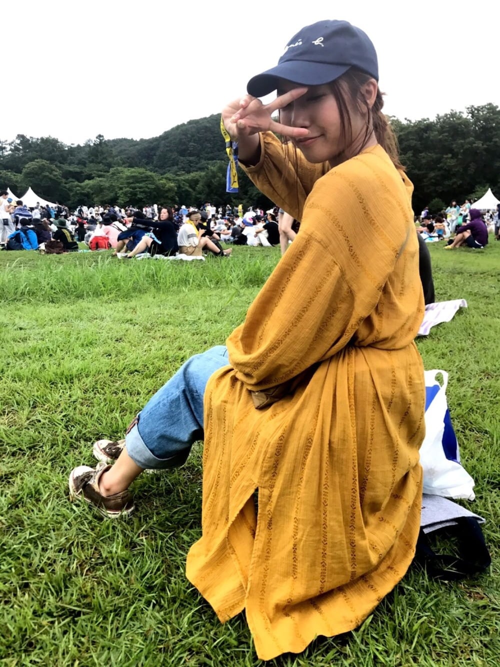 フェス2日目🌈🌻🍧 1日雨の予報だったので ZARAのデニムは 裾を追って履いています👖 本当はもっと 違う服装を したかったのですが 雨&寒さ対策で この服に落ち着きました😇 ピースマークなんて してますが ずっと雨だったので ビショビショで寒くて 大変でした😳 1番大変だったのは 『ぬかるみ』です。 オフホワイトの コンバースが 泥まみれの グロい色になりました🙄
