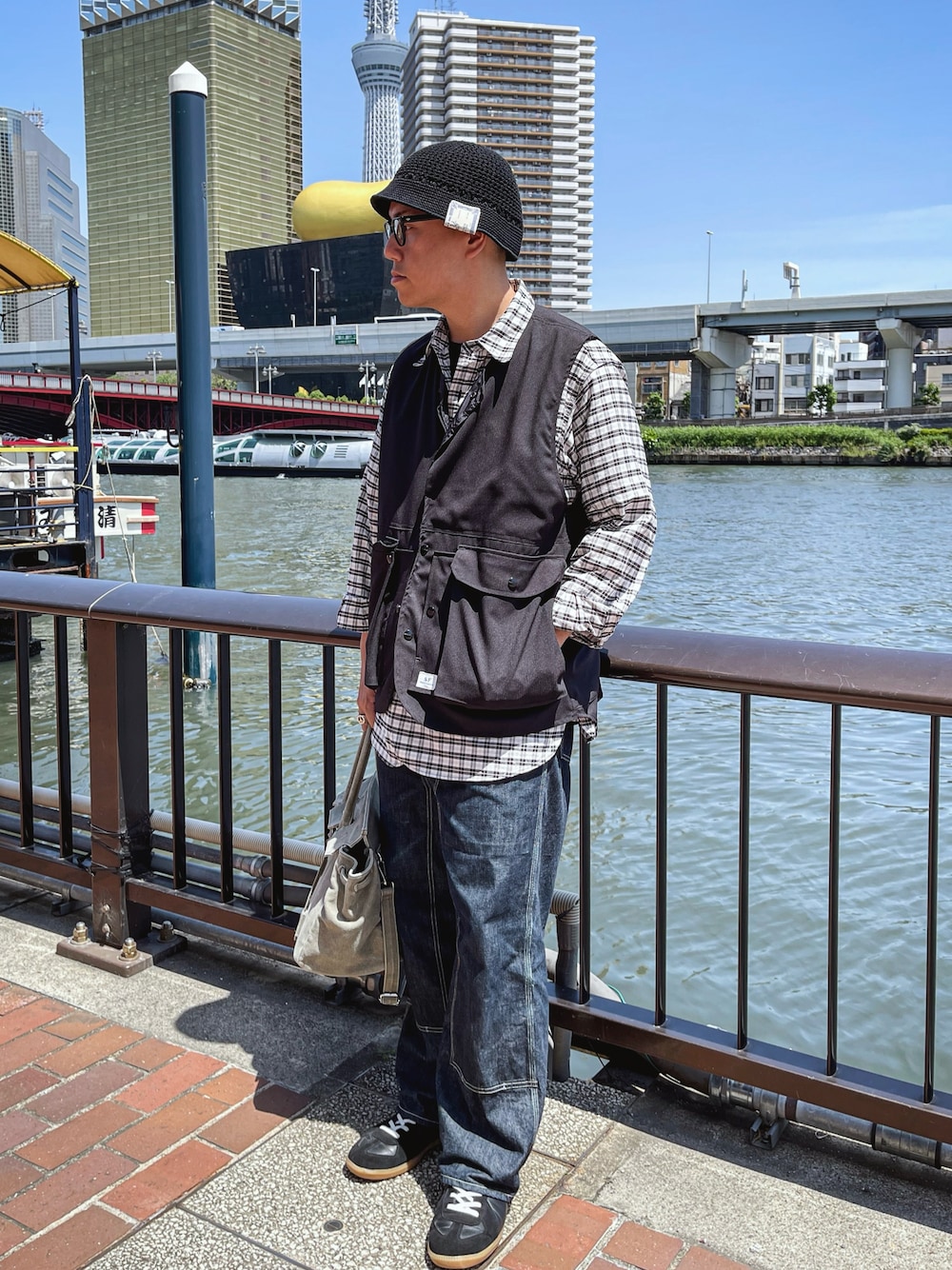 モノトーンのアイテムの中にインディゴのデニムを入れてアクセントに ヘッドウェアをニットハットにすることでリラックス感を出しています