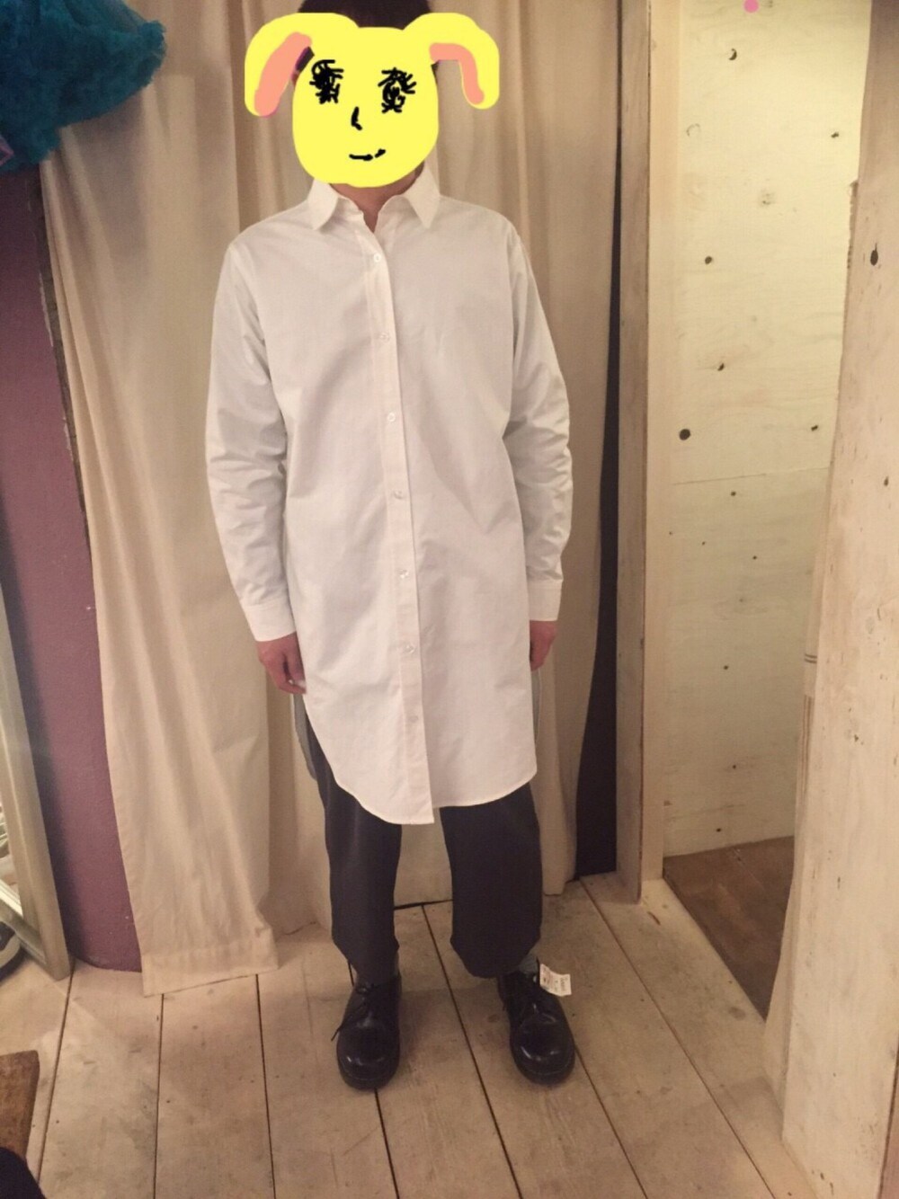 古着屋で一時間半、協議に協議を重ねた結果、このスタイルが決定しました。 オーバーシャツにワイドパンツ ドクターマーチンの靴はサイズがなく購入はしませんでしたし、写り方が悪いので変わりにくいですが自分史上初のモード系です。 オーバーシャツはサイドがすんごいスリットw 他の合わせ方がわからないほど。 ちなみにウサギの顔は友達が描いてくれましたw ぶさかわ?w