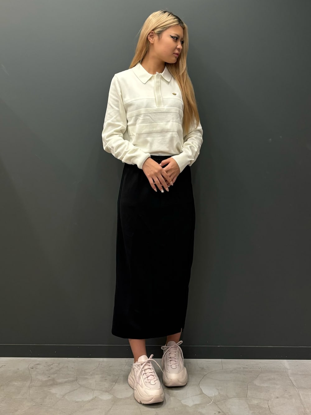 mirika(アディダス ブランドセンター 渋谷)のポロシャツ「プレミアム長袖ポロシャツ / アディダスオリジナルス adidas Originals」を使ったコーディネート