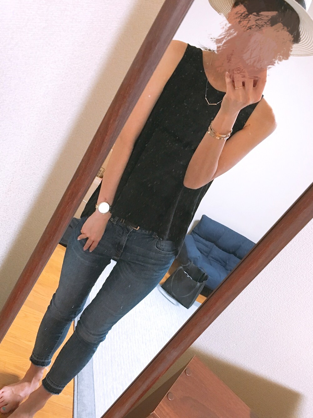 後ろが見えないけどギャザーが入っているノースリーブです。 シンプルだけど可愛い⍤⃝♡ 990円というプチプラも魅力的·͜·ೢ ⋆* ハットを合わせて夏らしくしてみました。