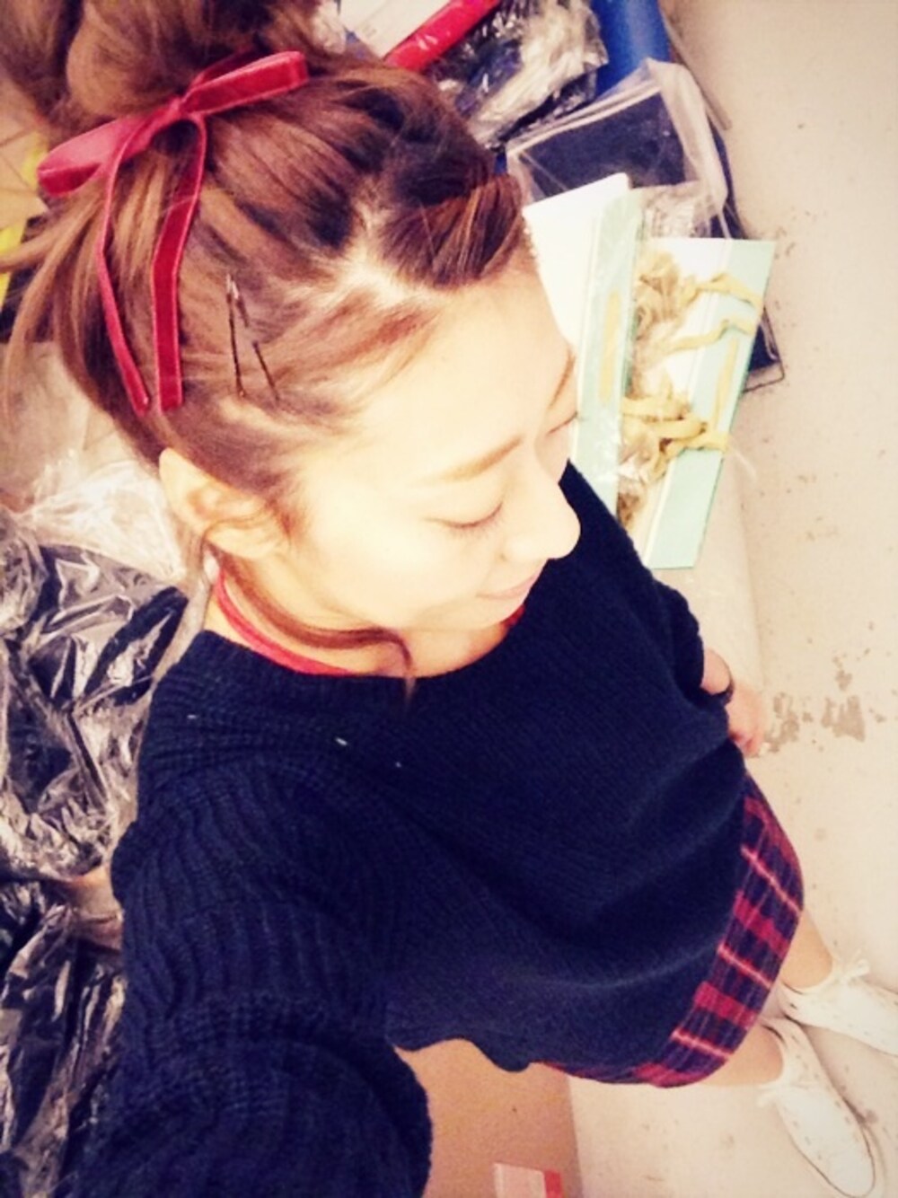 柄にもなく頭にリボン巻いてみましたw おニューのニット。 白が欲しいのにネイビーばかり買ってしまうw 助けてー! 今日はゆるゆる