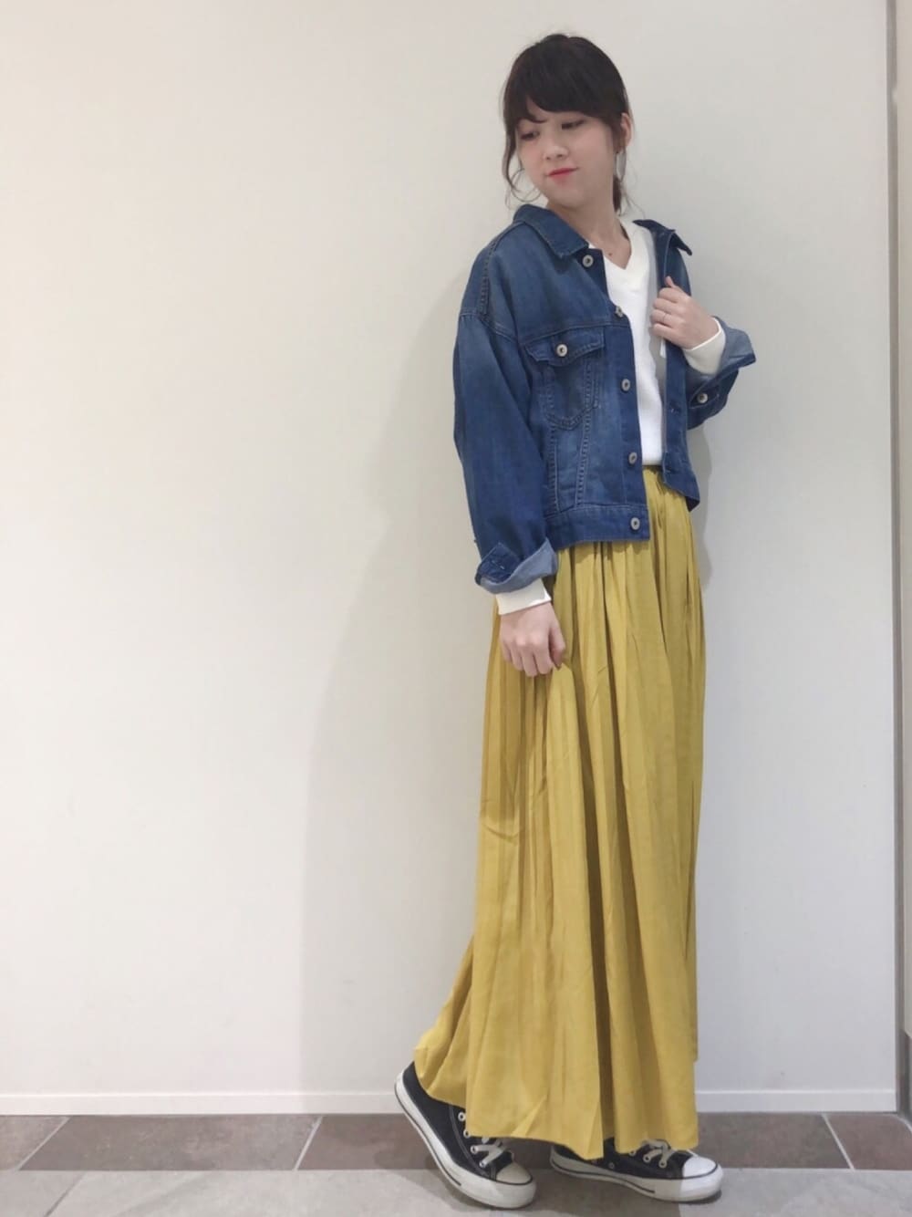 おすすめのジージャン!ゆったりしているので、中に厚手のものを着込むこともでき、抜け感を感じられるのもポイント◎ ワンウォッシュ派でしたが、今年はインディゴにカラースカートがかわいいです♡