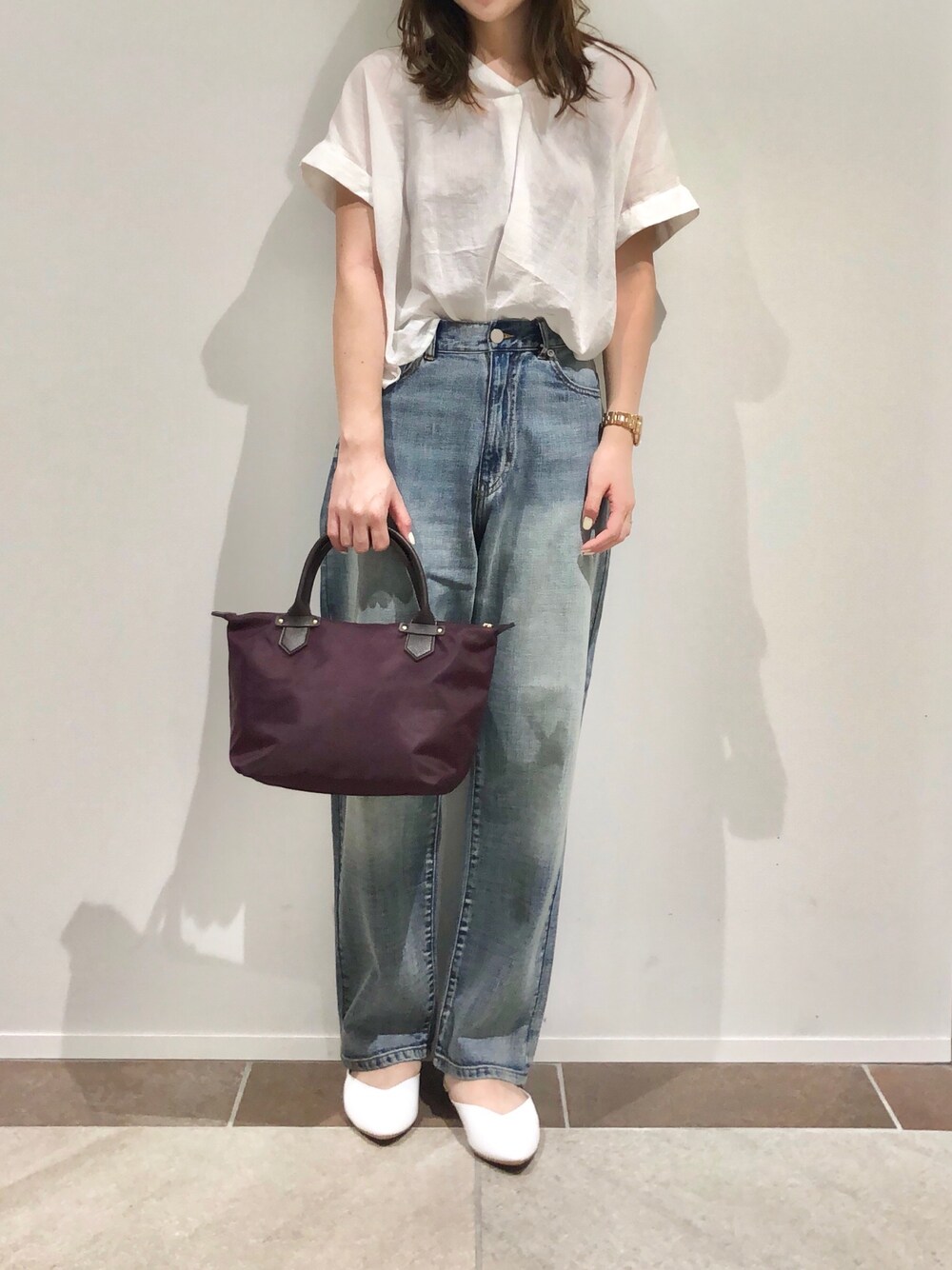 白シャツをブリーチデニムでカジュアルダウン!