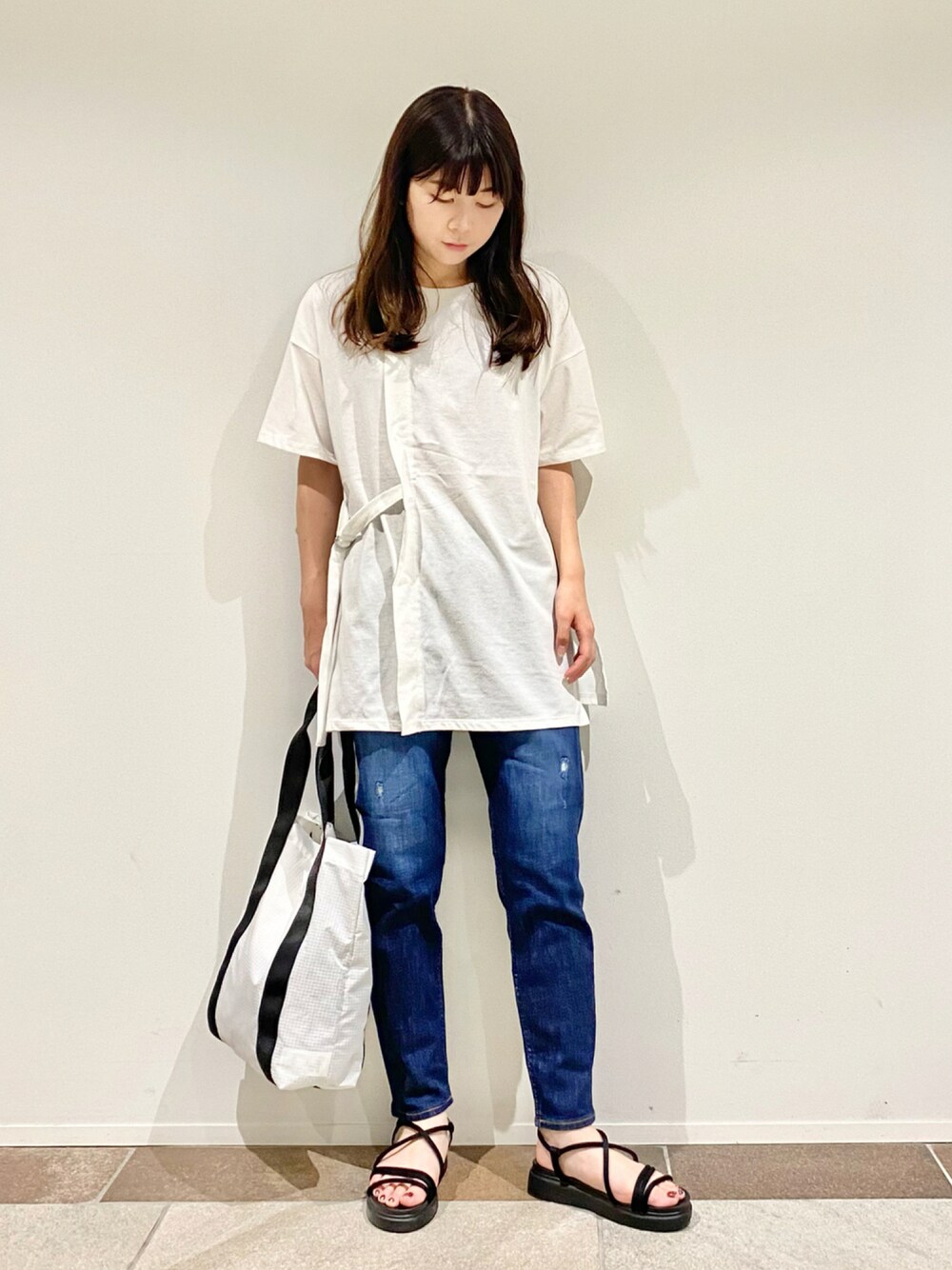 楽ちんチュニックコーデ シンプルな白チュニックよりも一癖あるサイドベルトが可愛い一枚。