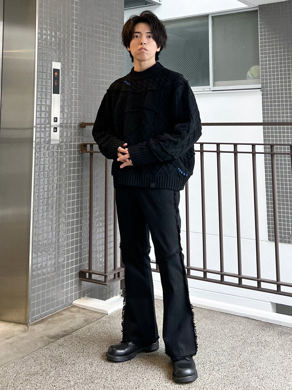 ZARA × ADERERRORのニットに GIDEAL.新作デニムを合わせたオールブラックコーデ🙋🏻 ニットのざっくりした編み目にワンポイントのブルーステッチと、 デニムのフリンジがアクセントになってワントーンでもよき✌︎