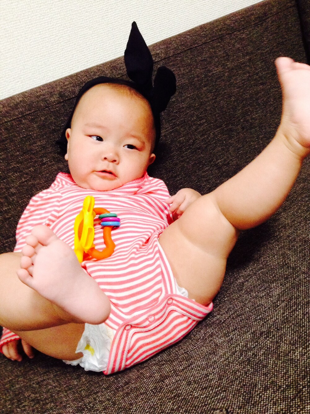 ギャルの真似して、ウサギちゃん風のリボンカチューシャ、赤白ボーダー。知ってか知らずか、荒ぶる赤子。