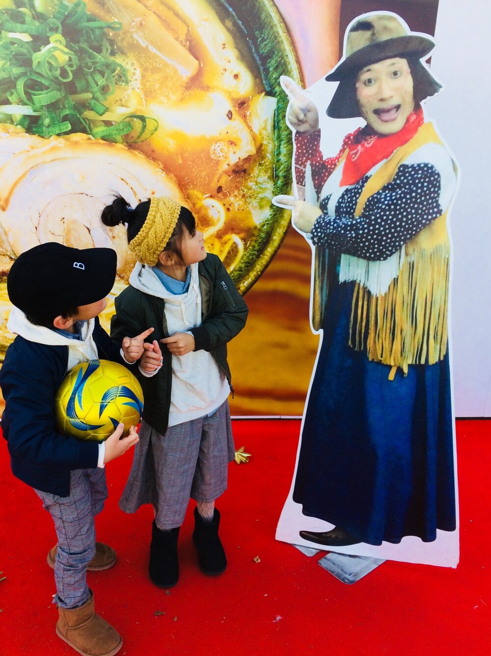 のぞいてくださってありがとうございまーす❤️ なんか朝からバタバタでまた遅くなりました💦 昨日は万博公園のラーメンエキスポに行ってましたー🍜 ラーメン大好きな2人は存分に楽しんでました♪(´ε` )💕 すちこさんを見つけて真似をしようとしてるところ🤣笑 珍しくがっつりおそろいコーデにしたのにコーデよりすちこさんが気になる…😂笑