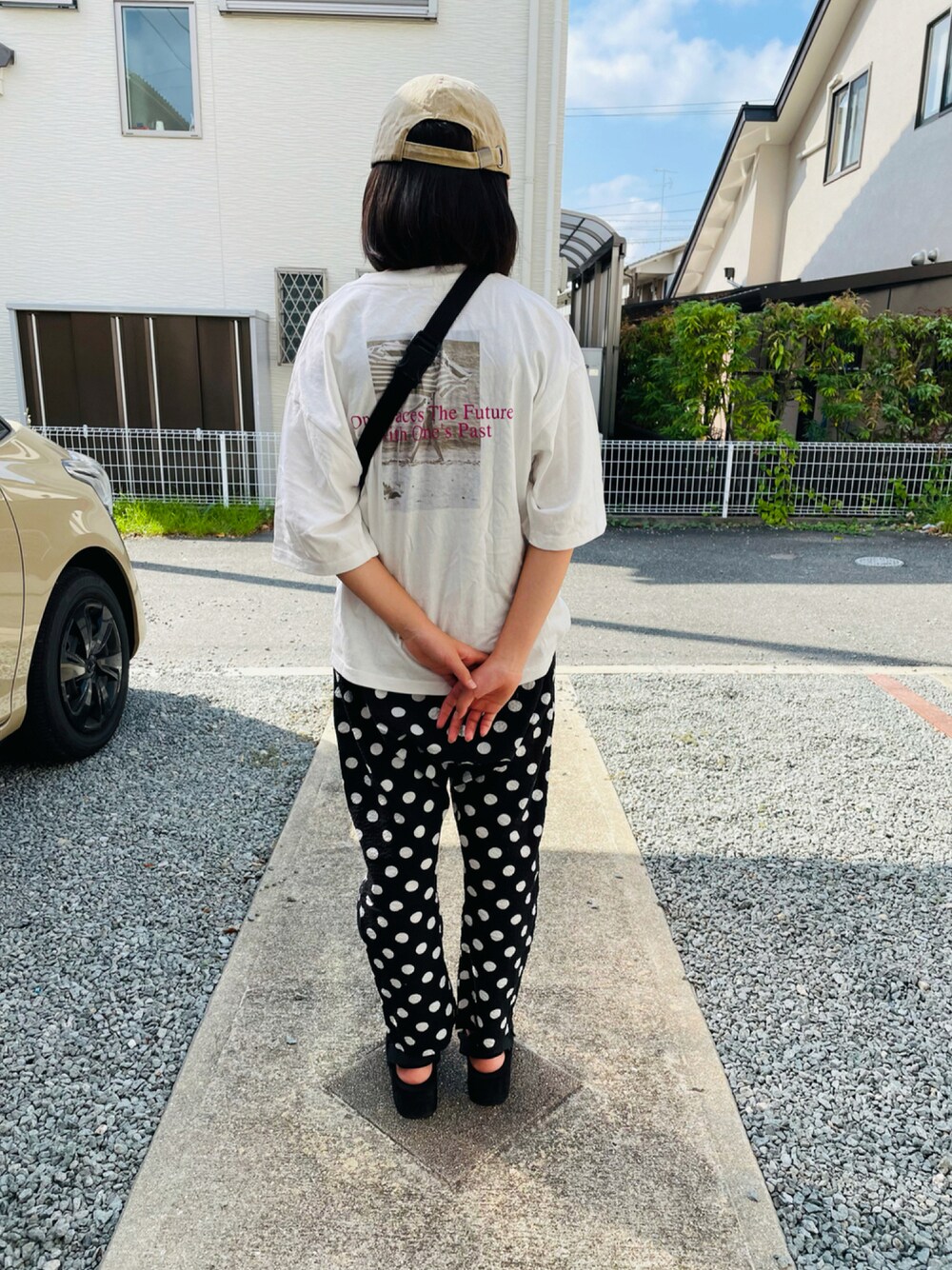 のぞいてくださってありがとうございまーす❤️ #白Tシャツ かわいいフォトT💕 これは後ろ姿を撮りたくなーる🎵 パンツはhokkorikoのドットリップル❤️ これはほんと涼しくて夏にもってこいな生地です✨