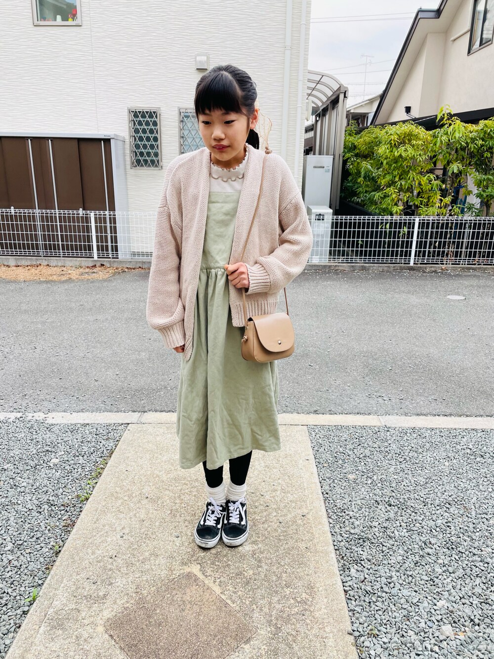 のぞいてくださってありがとうございまーす❤️ #春コーデ ちょっと寒い日🤣 ローリーズさんのかわいいジャンスカは色も形もよいです💚 そしてブランシェスさんのトップスが使える使える✨ かわいいゴムはりえちゃん作です🎀