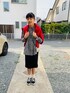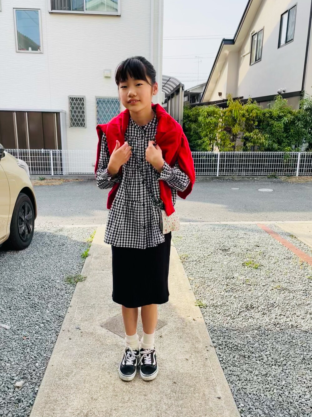 のぞいてくださってありがとうございまーす❤️ #肩掛けカーデ …無理矢理感🤣笑 肩のかけ具合が難しいです💦 もちろんそっとカーディガンは置いて学校に行きました😝笑 モノトーンに赤な色合わせは好きです❤️ トップスもスカートももはや何年着てるんやろ🍀 ずーっと大活躍なやつです✨