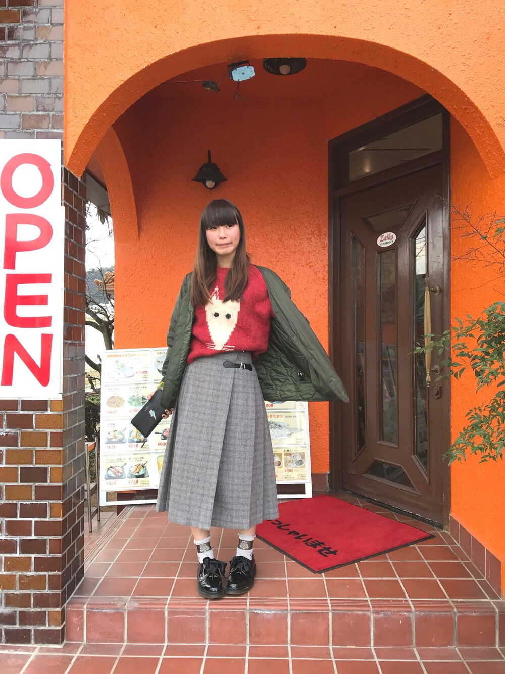 カレー屋さんの入口。美味しかった😃 太って顔がまるっこくなってきた😨 キツネのニットめっちゃお気に入り😊