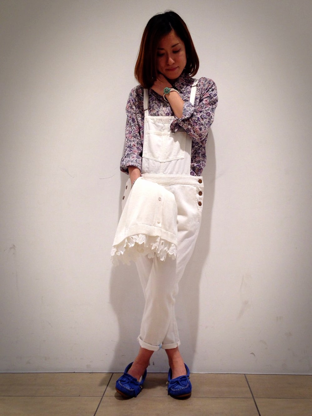 こんばんは\(^o^)/ 無事に緊張のお仕事も終わりまして、一安心しました~! 慣れないことをすると疲れるものです。 来月お知らせできると思いますので乞う?ご期待ください♪ 今日はまたもや(笑)、白です。 オールインワンが昔から大好きなのですが、この白のオーバーオールは一目みたときからずっと欲しくて欲しくて,,,やっとゲットです! 今年はデニムがトレンドであるなら、インナーのシャツはデニムシャツでもありなんでしょーか??! 手に持ってるのはカーディガン。 裾にレースがついててかわいいんです。 そんな今日この頃。