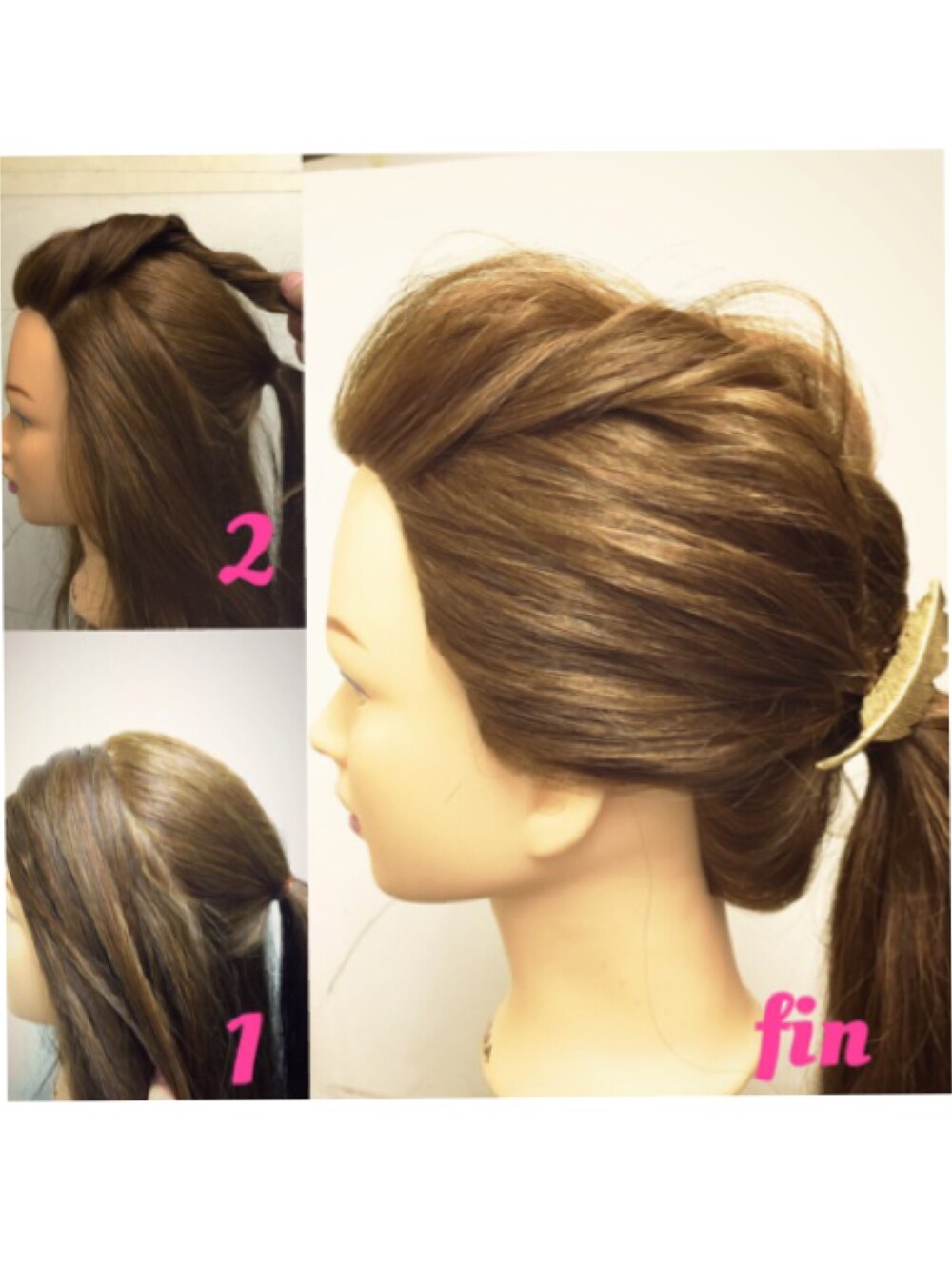 前髪がペタンとなってしまう方のアレンジ 1.前髪を外してポニーテールにします 2.前髪をねじりながらポニーテールに重ねて結びます(ポンパドールの要領で) 3.残りの部分をポニーテールに重ねて結びます 4.チラシたら完成☺︎