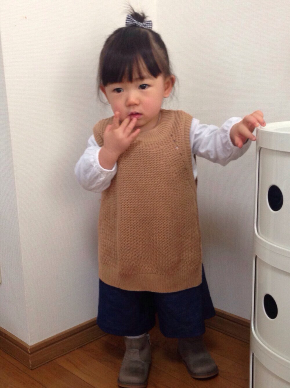 GLOBAL WORKに買い物に行った時にWEAR見て気になっていたニットベストをつい私とお揃いで買ってしまった💦以前は赤ちゃんは赤ちゃんらしい服がかわいいなぁと思っていたけど、最近大人っぽい服も可愛くて気になってしまう😊 GLOBAL WORKの服はSサイズでもまだ大きくてベストがワンピースみたいになってるー。足短いなぁ😅インナーは大きいのでGAPの80サイズのシャツを着ました。