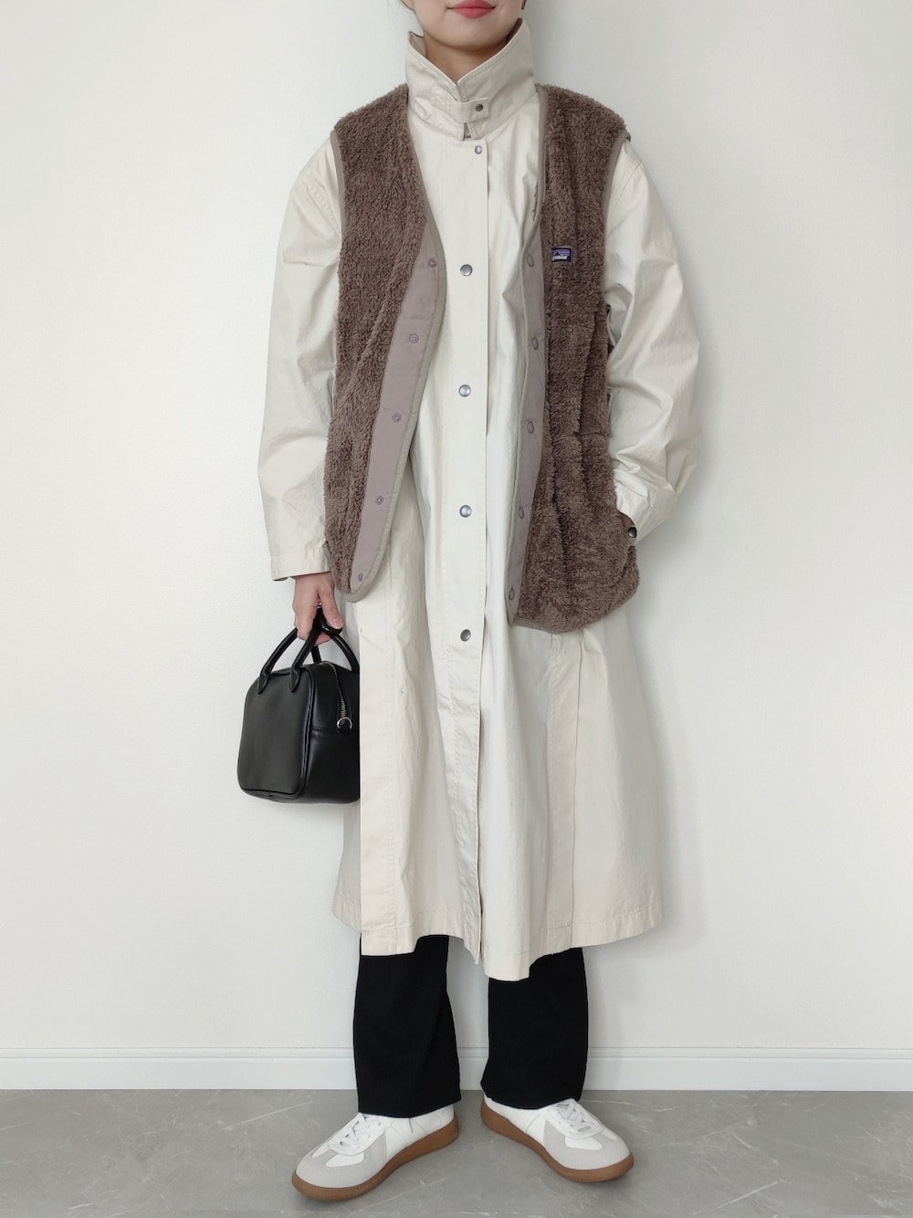 ユニクロのライトロングコートに パタゴニアのロスガトスベスト。 まだ薄手のコートだと寒いから ベストをプラスすれば暖かいですよー🙆 インスタ haltogo_style