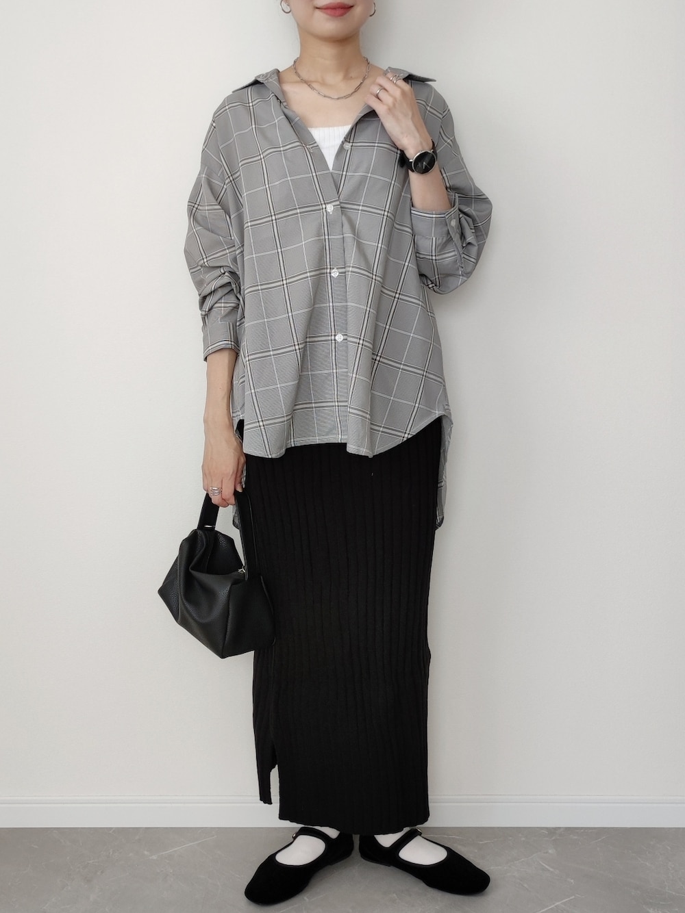 もう9月🎑 リブニットスカートに、チェックシャツ チェックを着ると秋らしくなる🍁 インスタ haltogo_style