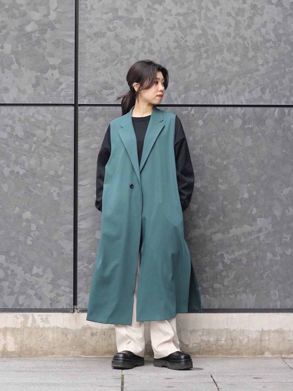 MITSUKIのテーラードジャケット「ノースリーブロングジャケット」を使ったコーディネート