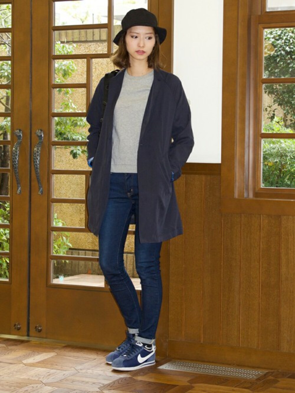 カットソー×デニムでシンプルだったので、ハットとコートでストリート感をプラスしました。 すっきりしたスタイルの時には、あえて大きいバックパックを合わせます。