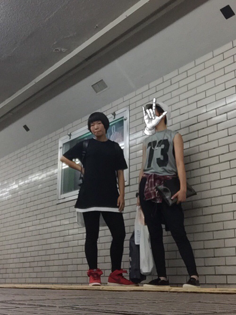 ブラック系のTシャツ/カットソー、ホワイト系のTシャツ/カットソー、レッド系のスニーカーを着用したレディースの秋コーディネートの1枚目の写真