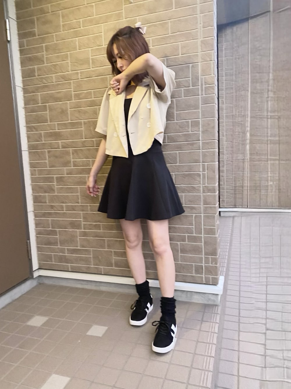 ホワイト系のセットアップ、ブラック系のスカート、ブラック系のスニーカーを着用したレディースの夏コーディネートの1枚目の写真