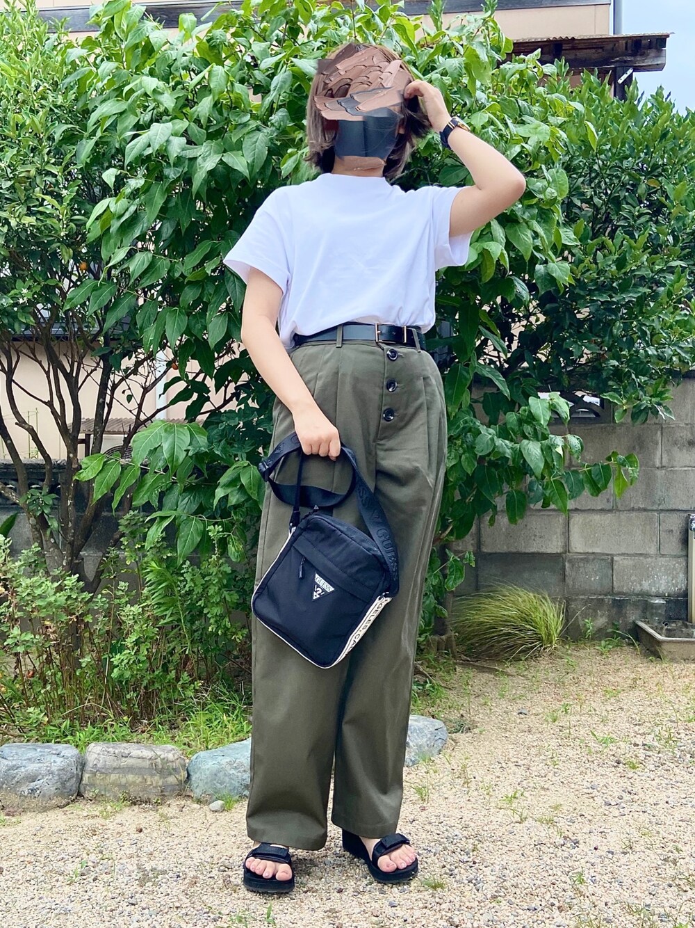 シンプル普段着コーデ 白×黒×オリーブ オリーブカラーのチノパンツ可愛い、、 プライスダウンで¥590で買えました、、🤍 プチプラばかり買うので腕時計とバッグ以外GUです、(笑)!!