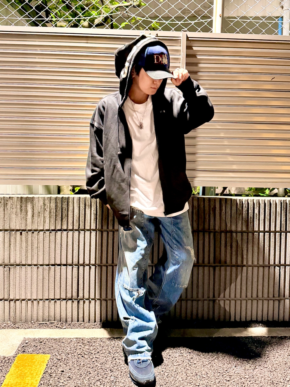 ダメージデニム×黒パーカー×メッシュキャップで、平成感のあるストリートスタイルのコーデを組んでみました! フードのロゴがめっちゃ可愛いから、 後ろ姿も可愛いし、フードを被ったスタイルもおススメです!