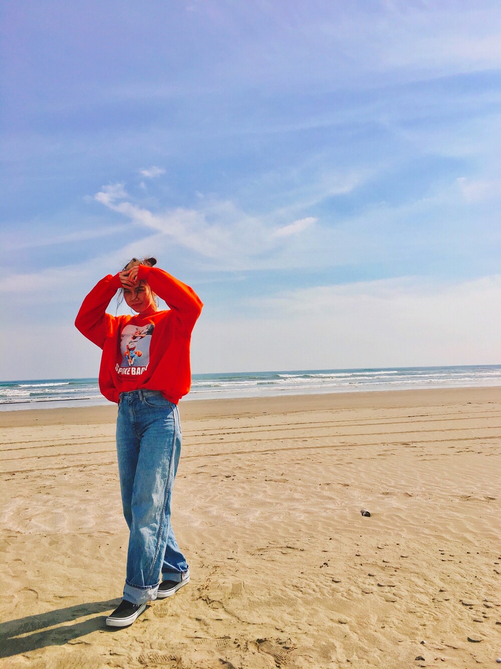 最近、赤をよく着る( ^ω^ ) これは原宿で購入〜 デニムはお気に入りすぎて 使いまくり👆