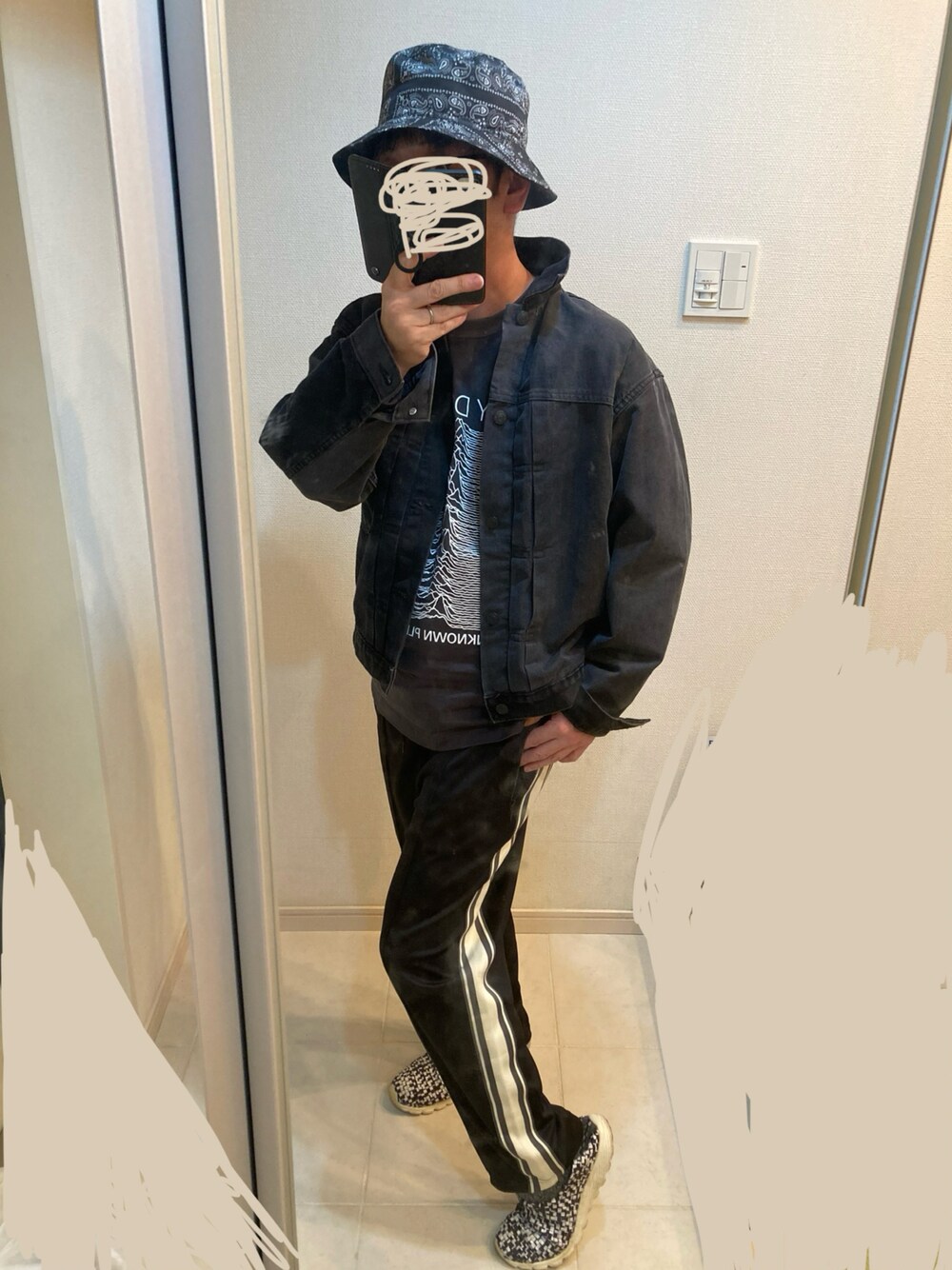 #秋コーデ #休日コーデ #大人カジュアル #モノトーンコーデ #バケットハット #デニムジャケット #ロンt #joydivision #トラックパンツ #スリッポン #プチプラコーデ #gu #gumiharayasuhiro