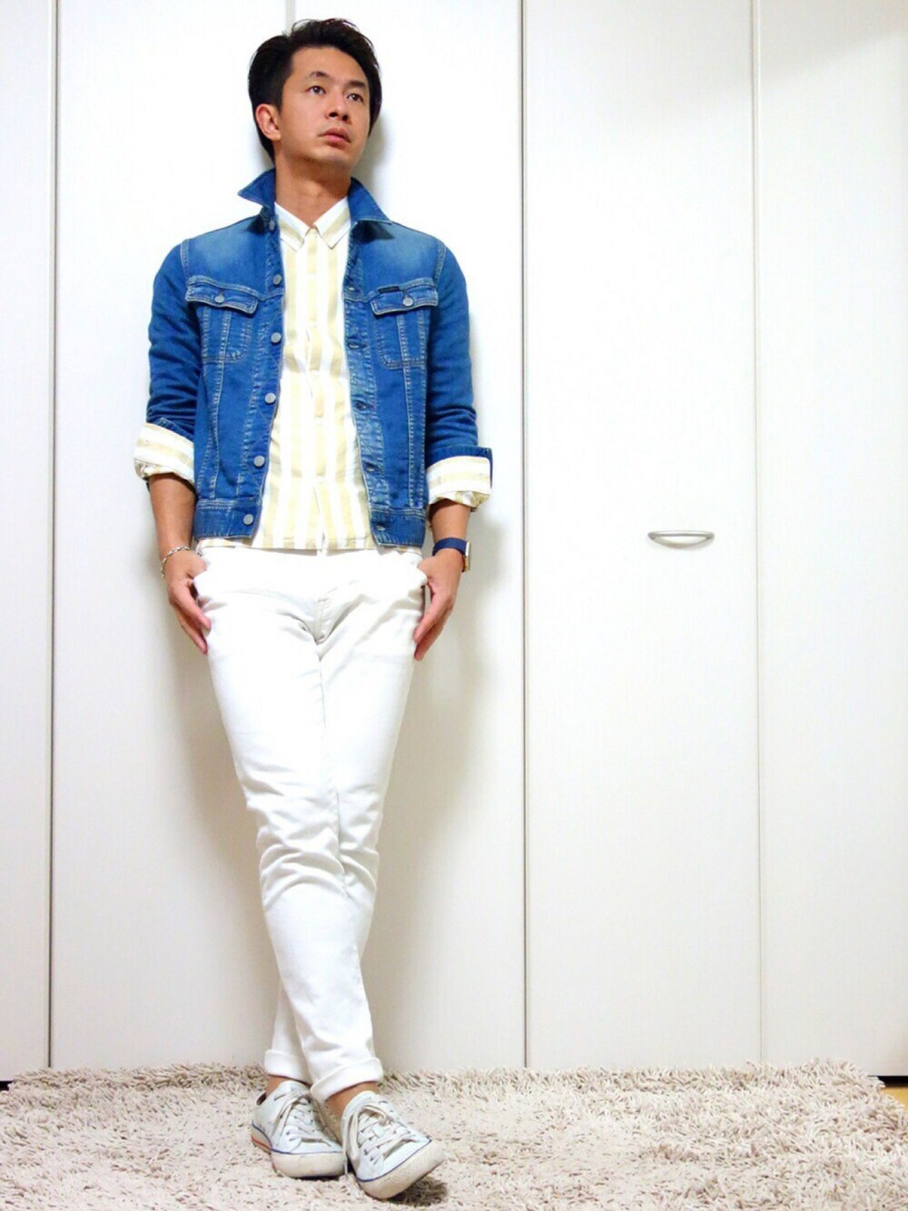 第96回wearコーディネート✨ デニムジャケットバリエーションコーデPart6🎶 おはようございます😃 今日で最後になるデニムジャケットコーデ✨ インナーはユニクロルメールのストライプシャツ❗️ パンツはヒス❗️ シューズもヒスです😁 それでは皆様今日もよろしくお願いします😄