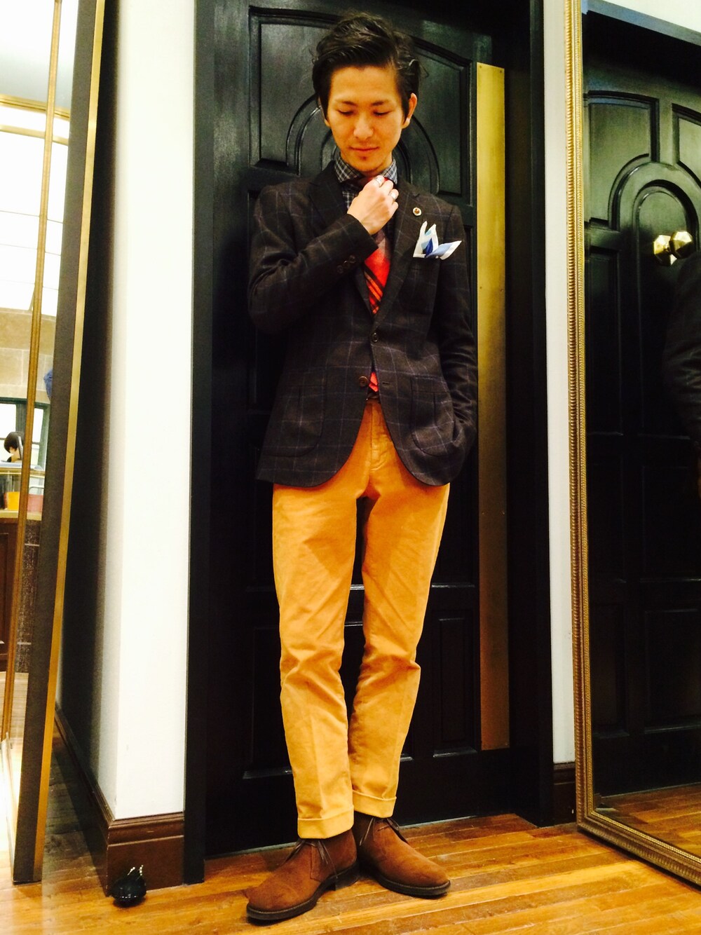 ジャケット: AQUOIBONISTE シャツ: nano universe library ネクタイ: nano universe library パンツ: INCOTEX シューズ: Loake チーフ: nano universe library
