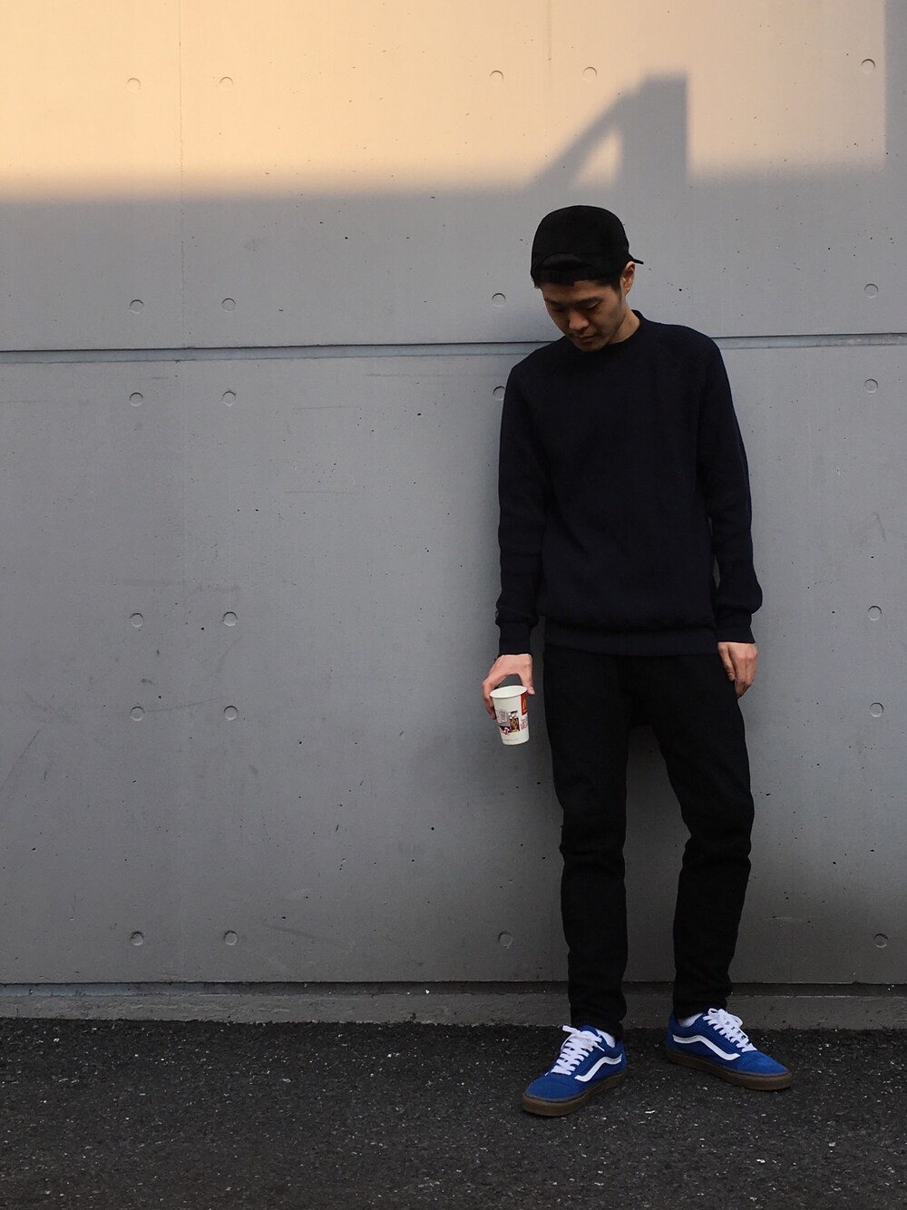 ブルー系のスウェットを着用したメンズの秋コーディネートの1枚目の写真