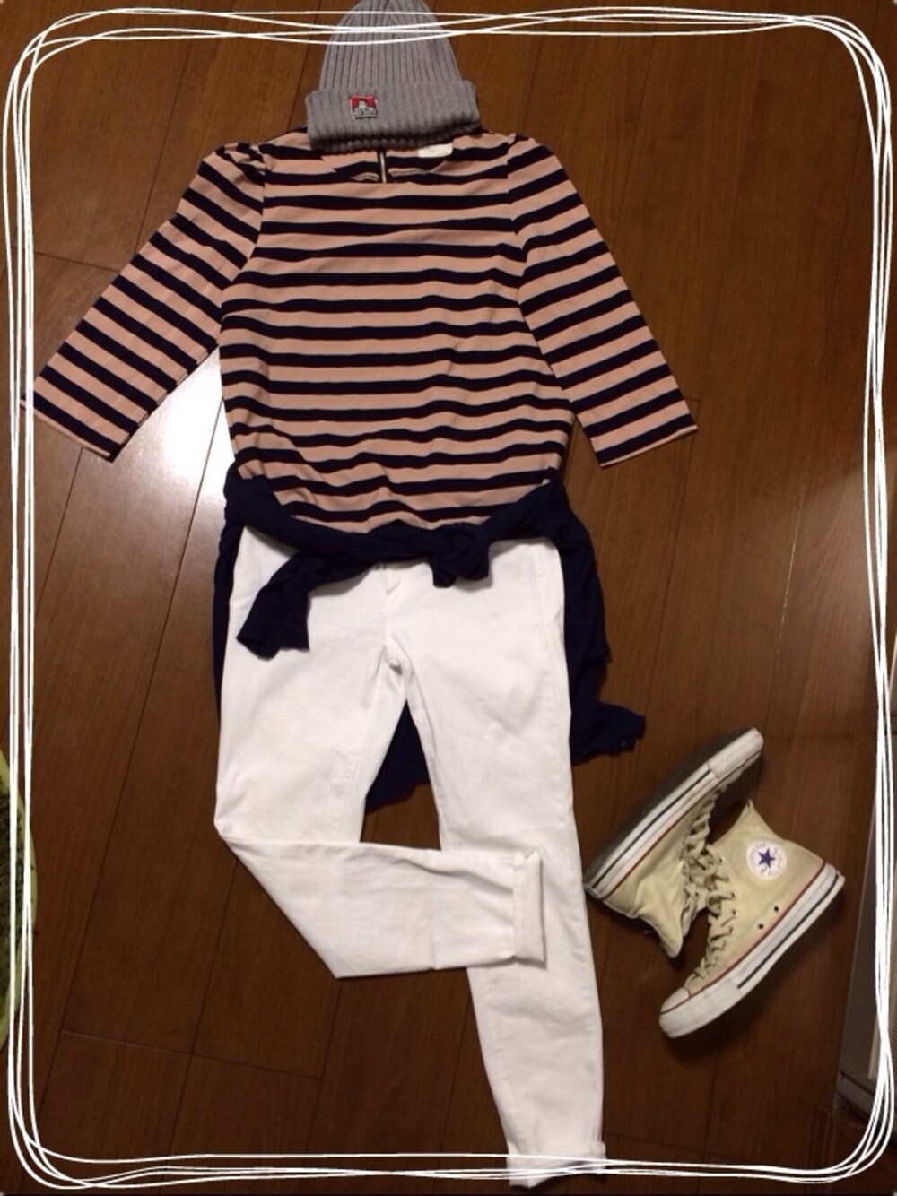 トップス...韓国 カーデ...LOWRYS FARM ボトム...UNIQLO ニット帽...BEN DAVIS 旦那さんに買ってもらったピアス。 キャッチが大きいパールで 逆に付けても可愛い♡