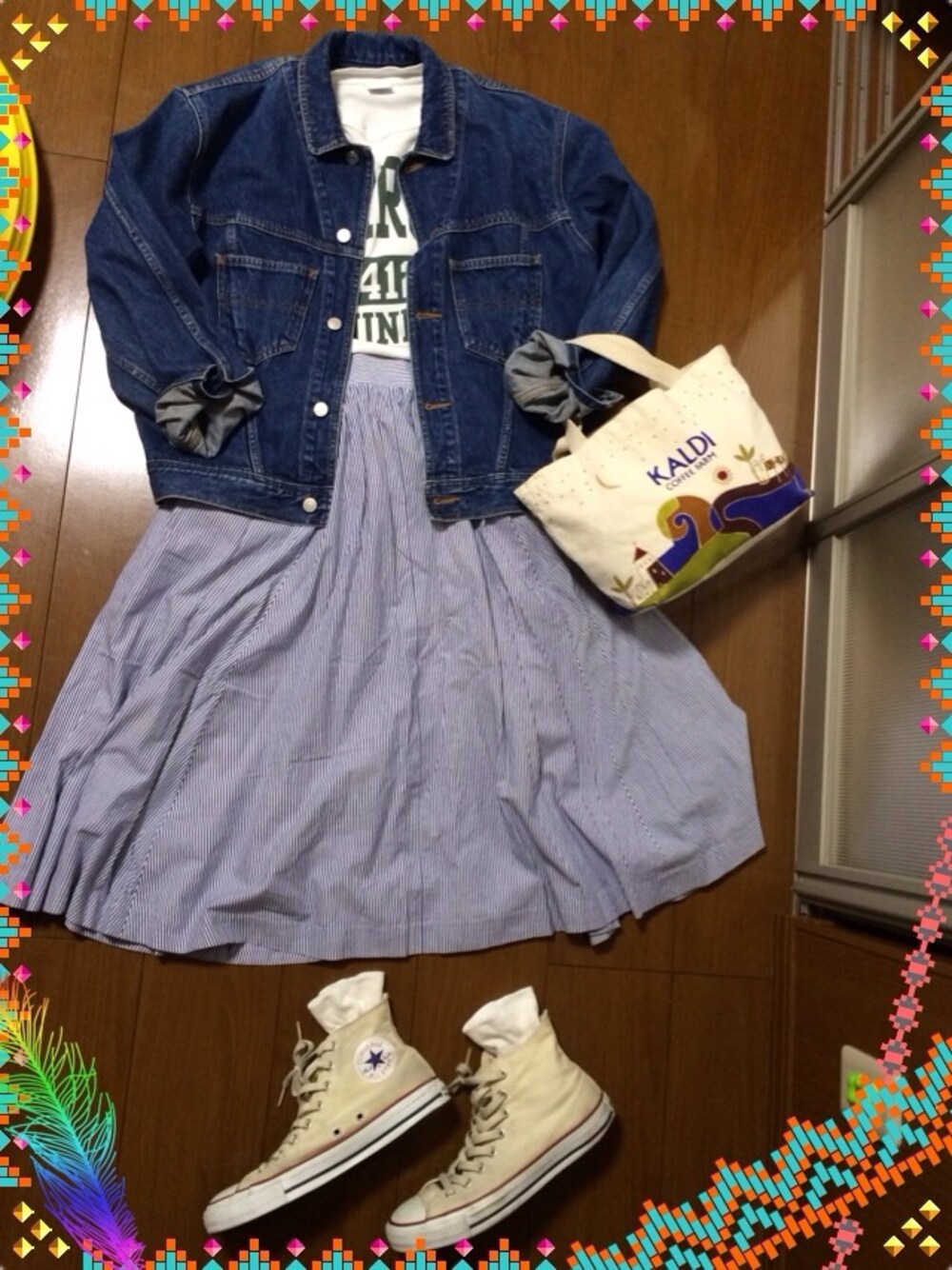 Gジャン...古着 Tシャツ...チャンピオン スカート...フリマで バック...カルディ コーヒーとセットで売ってたカルディのトート使いやすくてお気に入り♡ アウトドアってよりピクニック寄りのコーデ^_^;