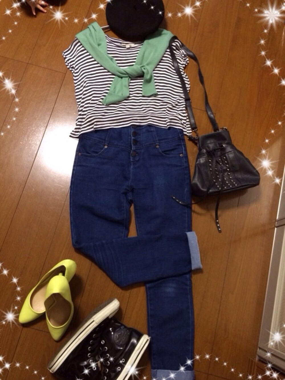 ベレー帽...もらいもの トップス...ZARA カーデ...LOWRYS FARM スキニー...GAL STAR パンプス...WEGO スニーカー...コンバース スニーカーかパンプスで悩む꒰ ´͈ω`͈꒱