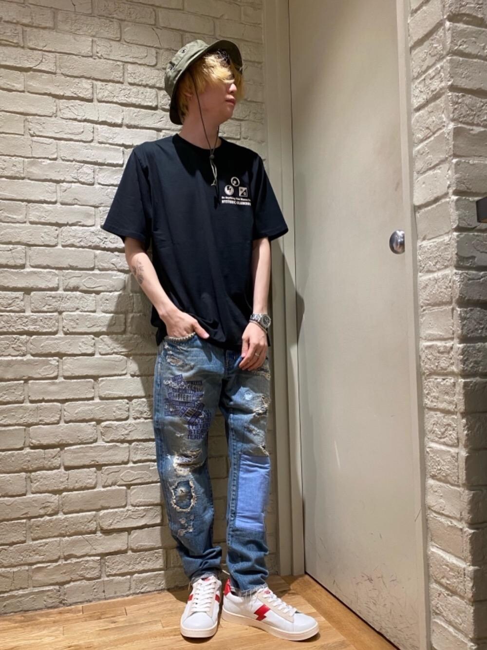 Mitsu(HYSTERIC GLAMOUR横浜ジョイナス店)のデニムパンツ「COLLAGE REMAKE加工デニム テーパードパンツ」を使ったコーディネート