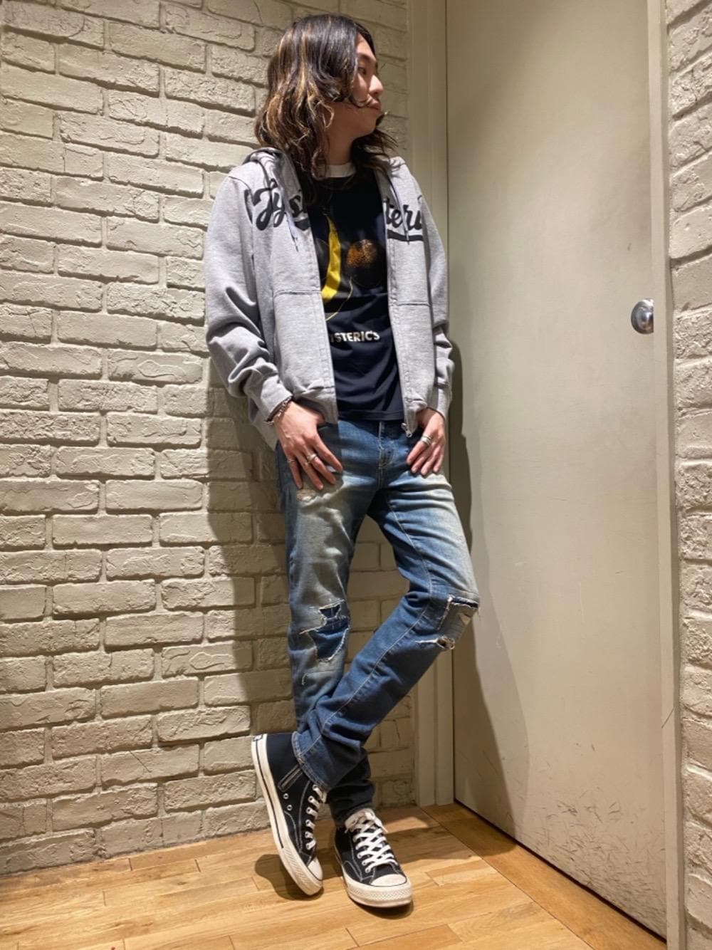 Mitsu(HYSTERIC GLAMOUR横浜ジョイナス店)のデニムパンツ「KPR加工ISKOリメイクスリムデニムパンツ」を使ったコーディネート