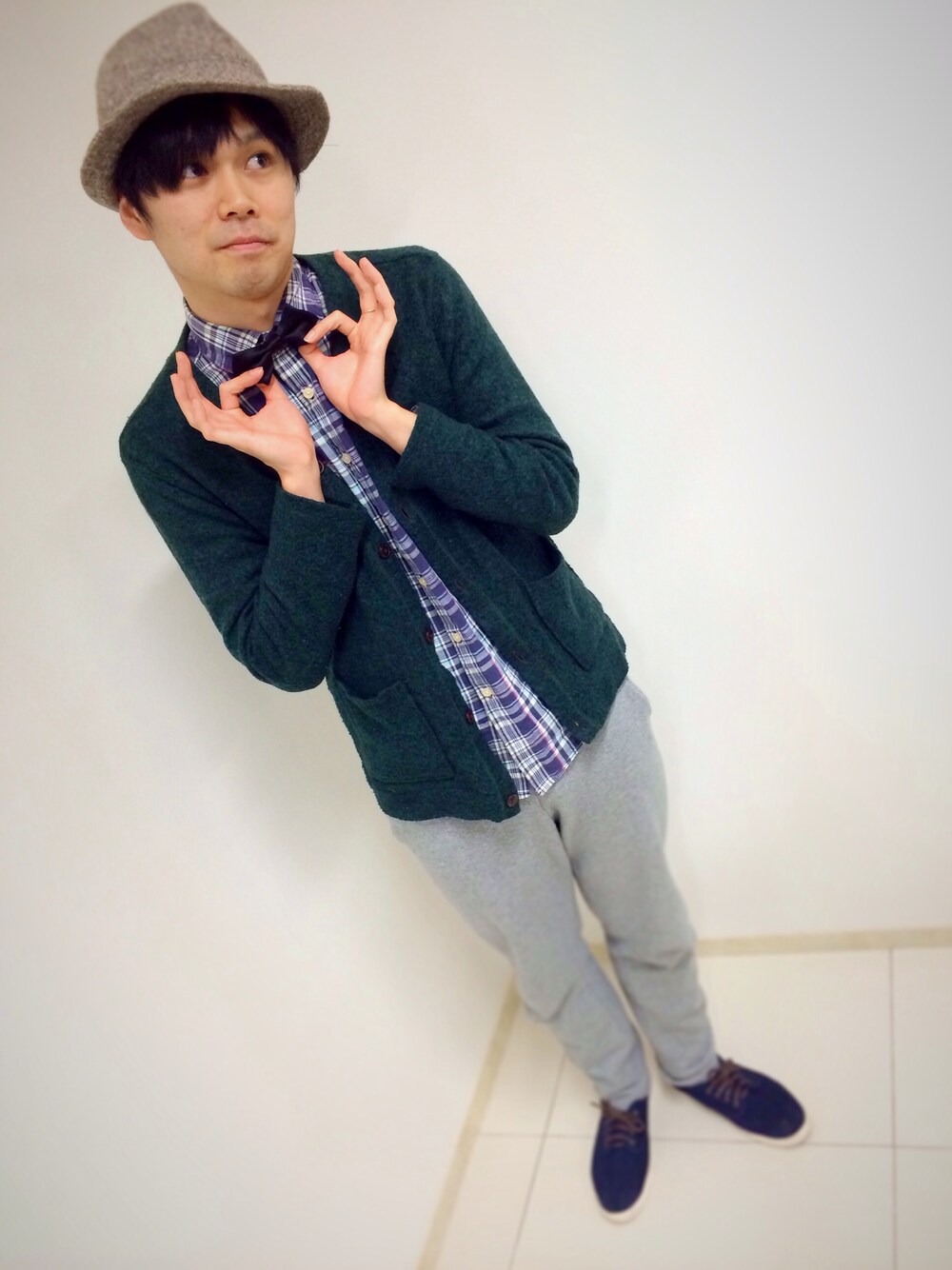 シャツ・UNIQLO シューズ・VANS 蝶ネクタイ型変声機