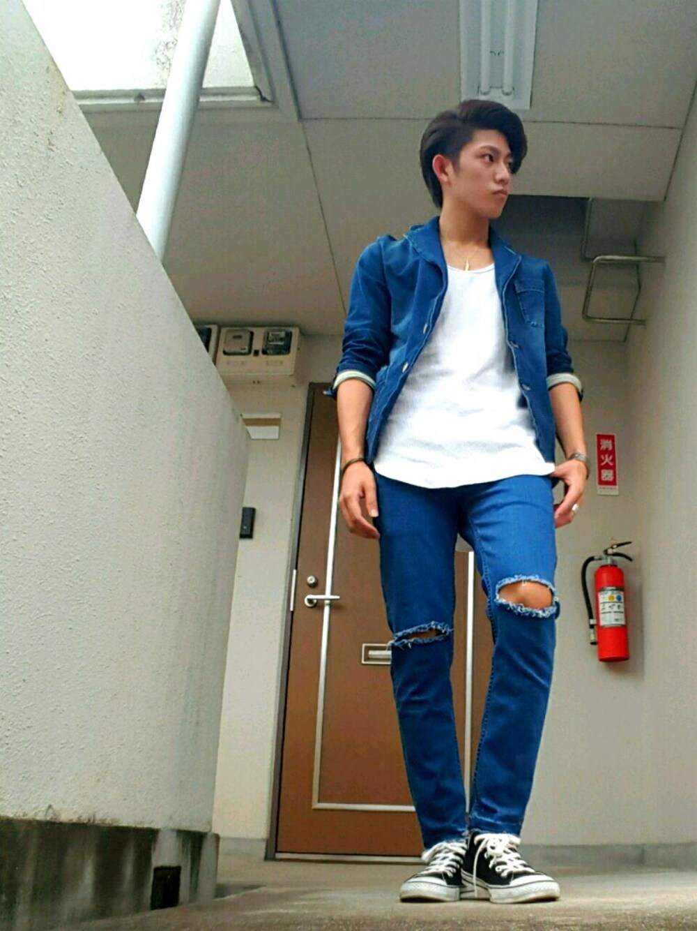 デニム×デニム (インディゴ×インディゴ) 昔買ったインディゴのジャケットを最近買ったインディゴダメージパンツと融合😏 ファッションのこういうとこ好き👍