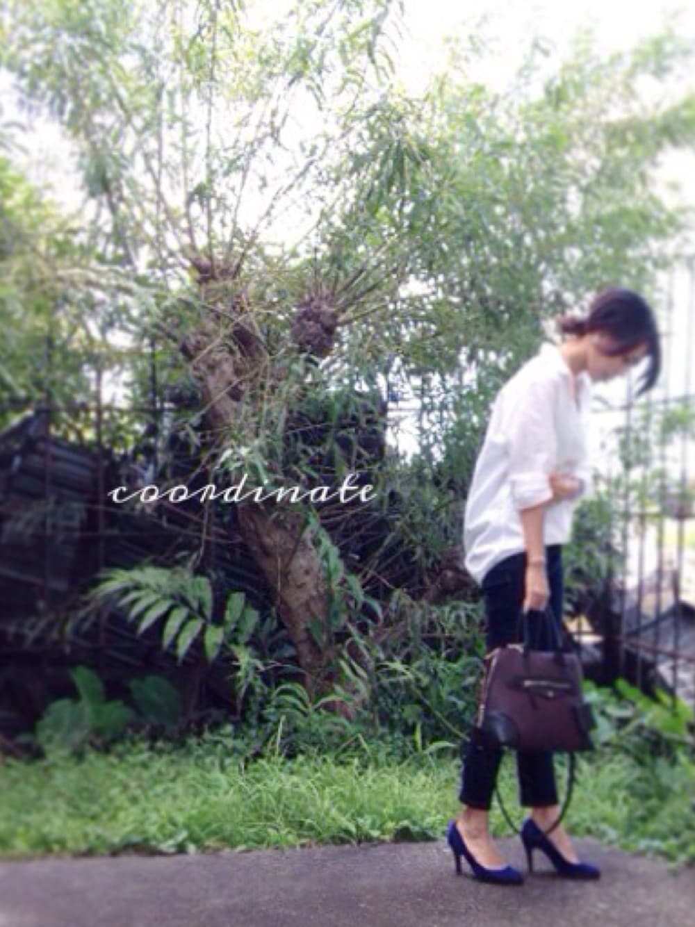 ホワイト系のシャツ/ブラウス、ブルー系のデニムパンツ、ブラウン系のバッグを着用したレディースの秋コーディネートの1枚目の写真