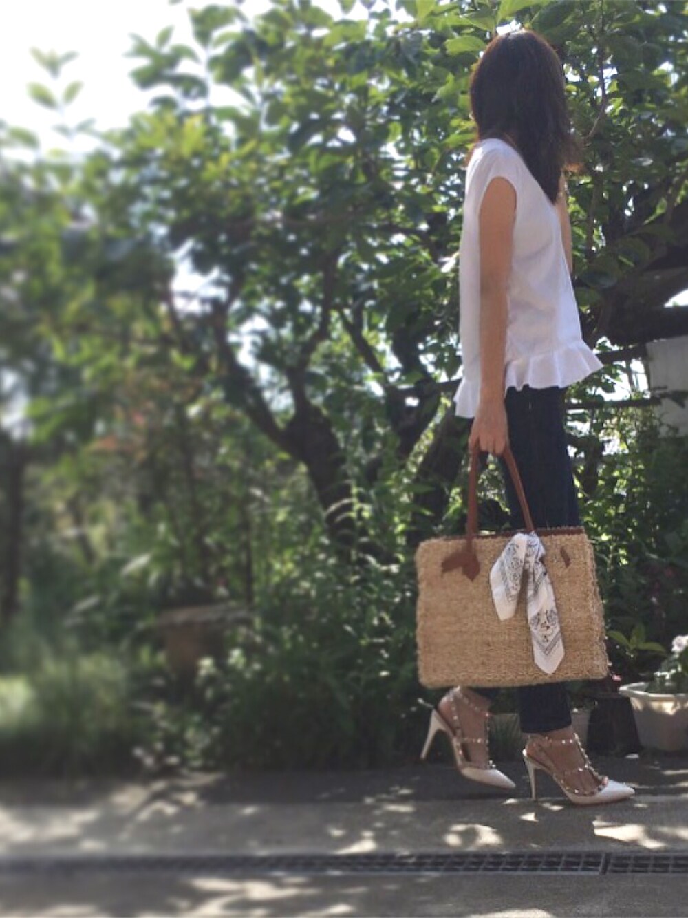 ホワイト系のTシャツ/カットソー、ブルー系のデニムパンツ、ブラウン系のトートバッグを着用したレディースの夏コーディネートの1枚目の写真