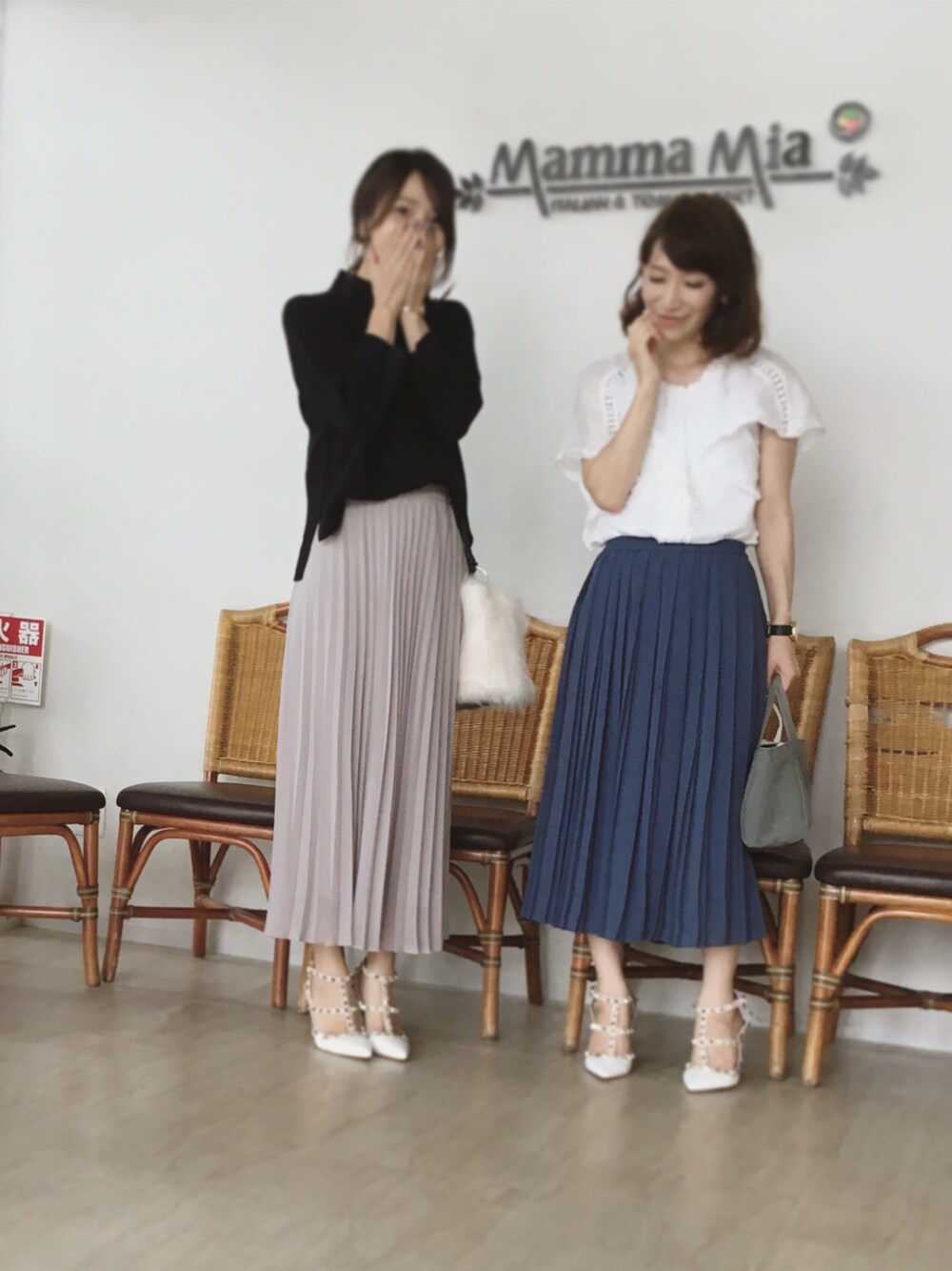 グレー系のスカート、ブラック系のニット/セーター、ホワイト系のショルダーバッグを着用したレディースの秋コーディネートの1枚目の写真