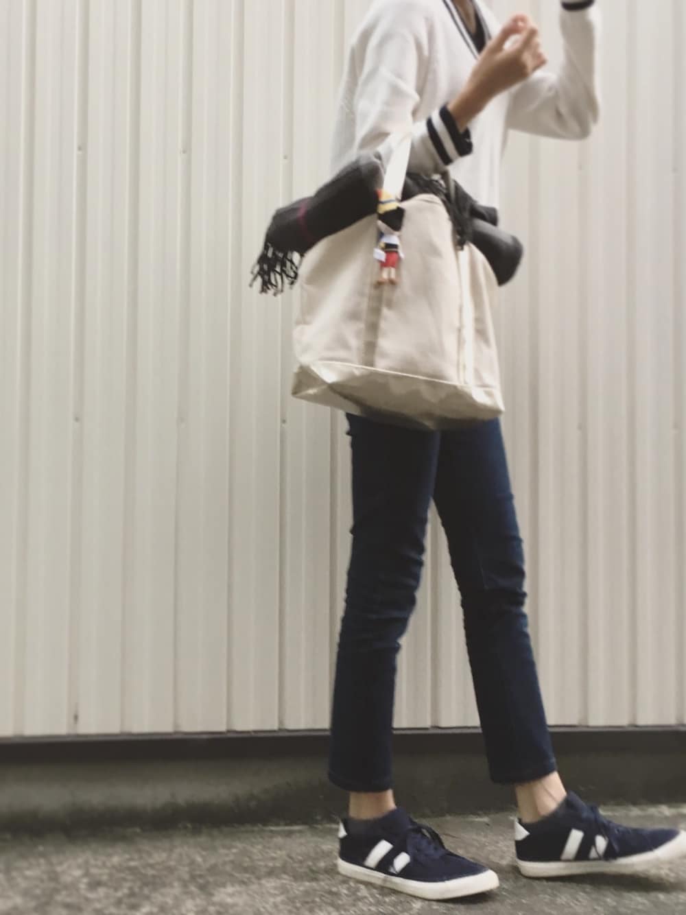 ブルー系のデニムパンツ、ブルー系のスニーカー、ホワイト系のニット/セーターを着用したレディースの秋コーディネートの1枚目の写真